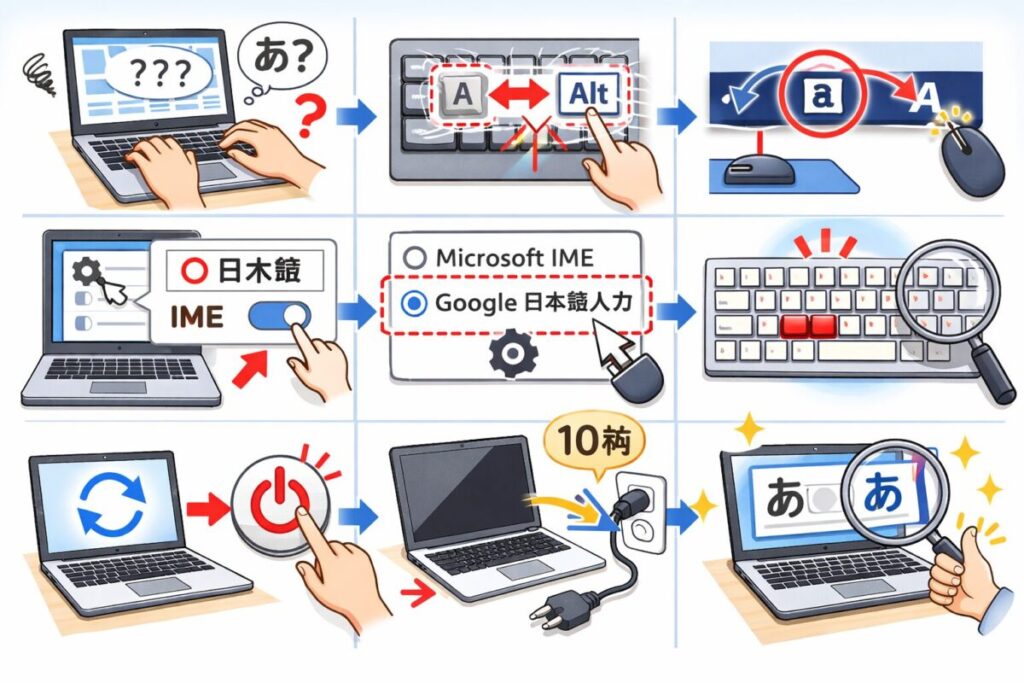 日本語入力できないときは、いきなり設定を触るのではなく、症状の出方で原因を絞り込むのがポイントです。